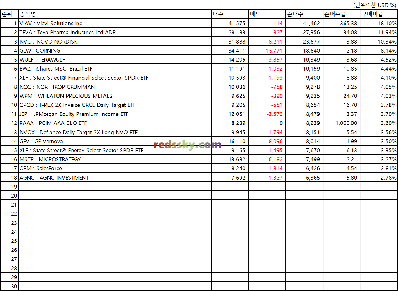 - PAAA > VIAV > TEVA > WPM > CRCD 순으로 순매수율이 높았다.