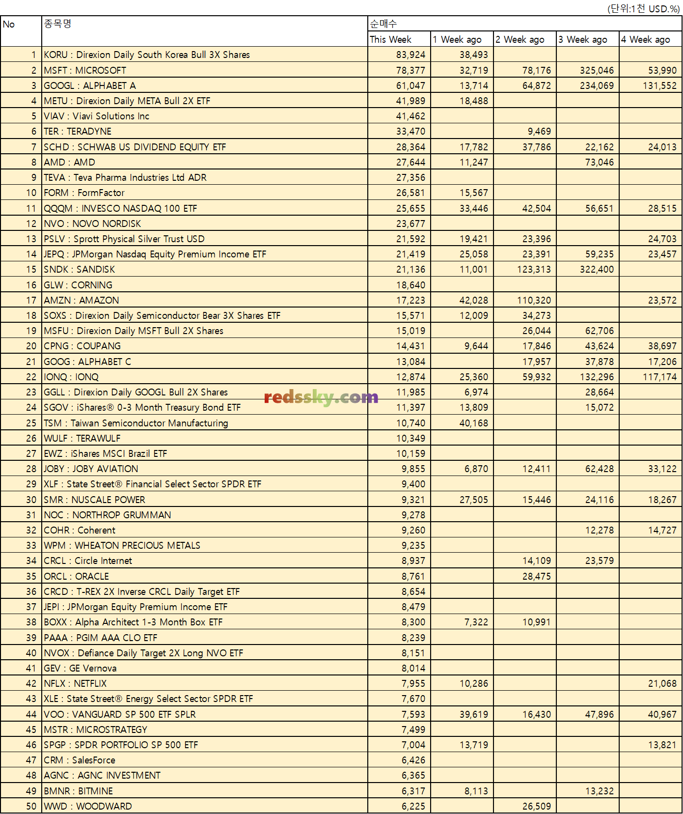 - 2주 연속으로 SNDK과 GOOGL의 순매도가 눈에 띈다.