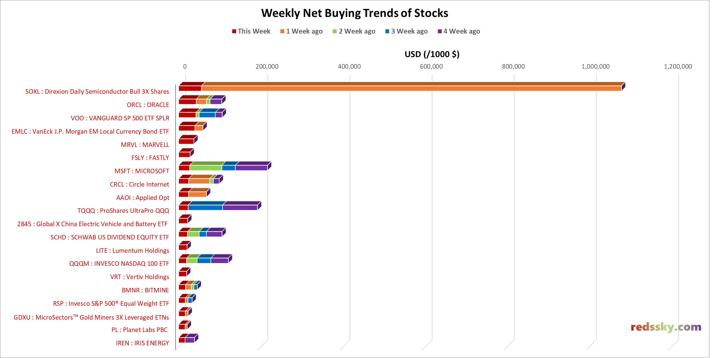 - 지난주 SOXL > ORCL > VOO > EMLC > MRVL 순으로 순매수가 있었음