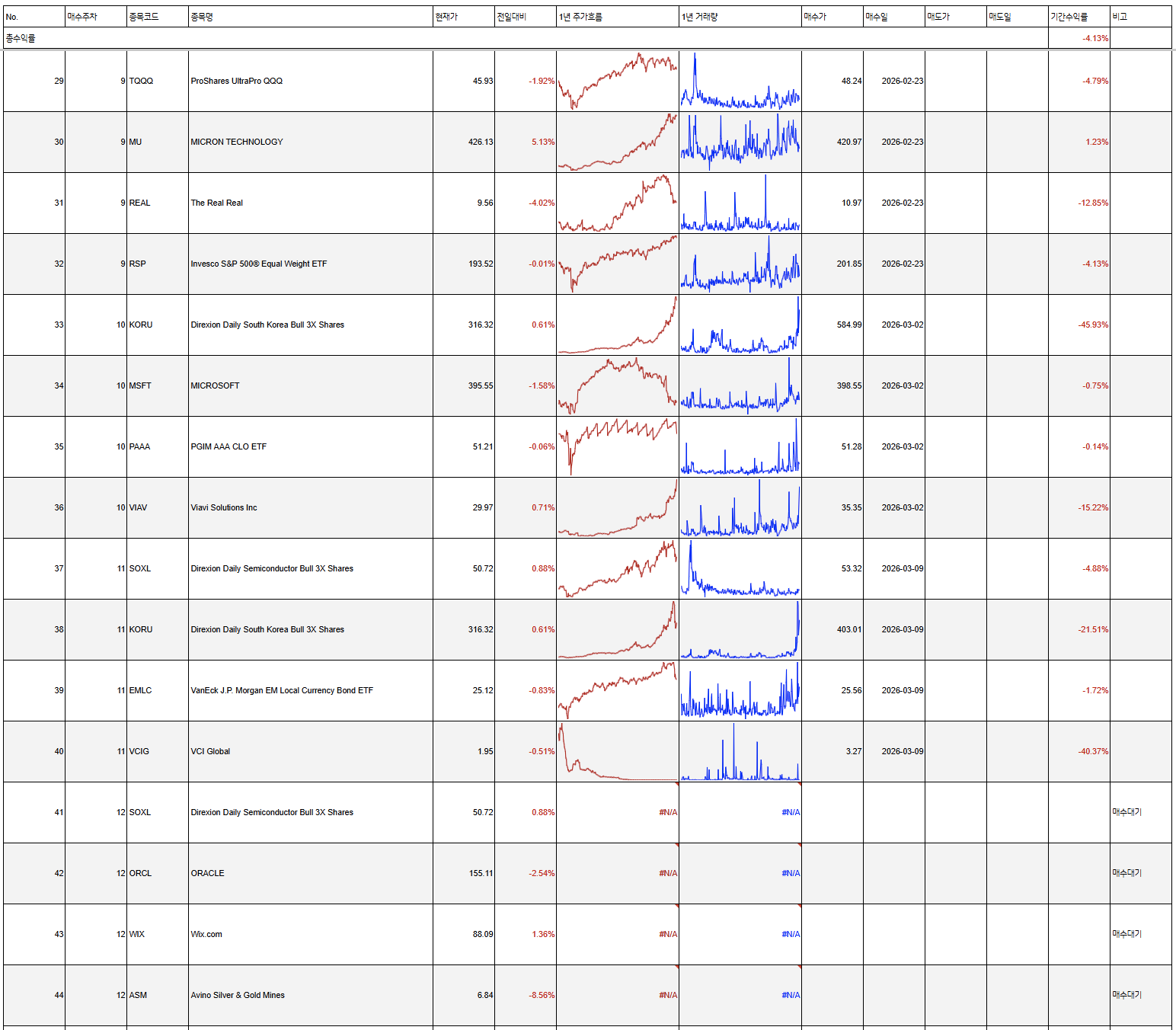 - 2026년 03월 06일 (금) 종가기준으로 2026년 첫 주의 기간내 총수익률은 이전주 3.14% => 4.13%로 변경되었다.