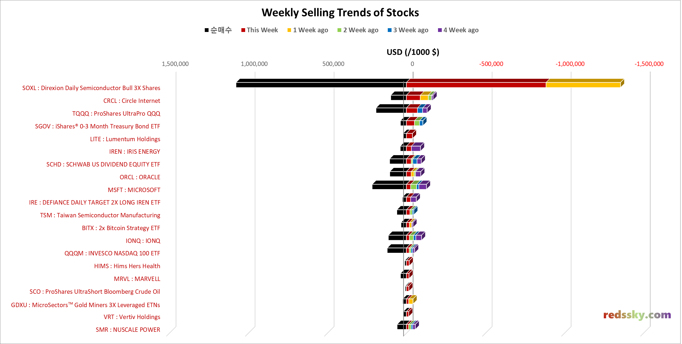 - 지난주 SOXL > CRCL > TQQQ > SGOV > LITE 순으로 매도가 있었음