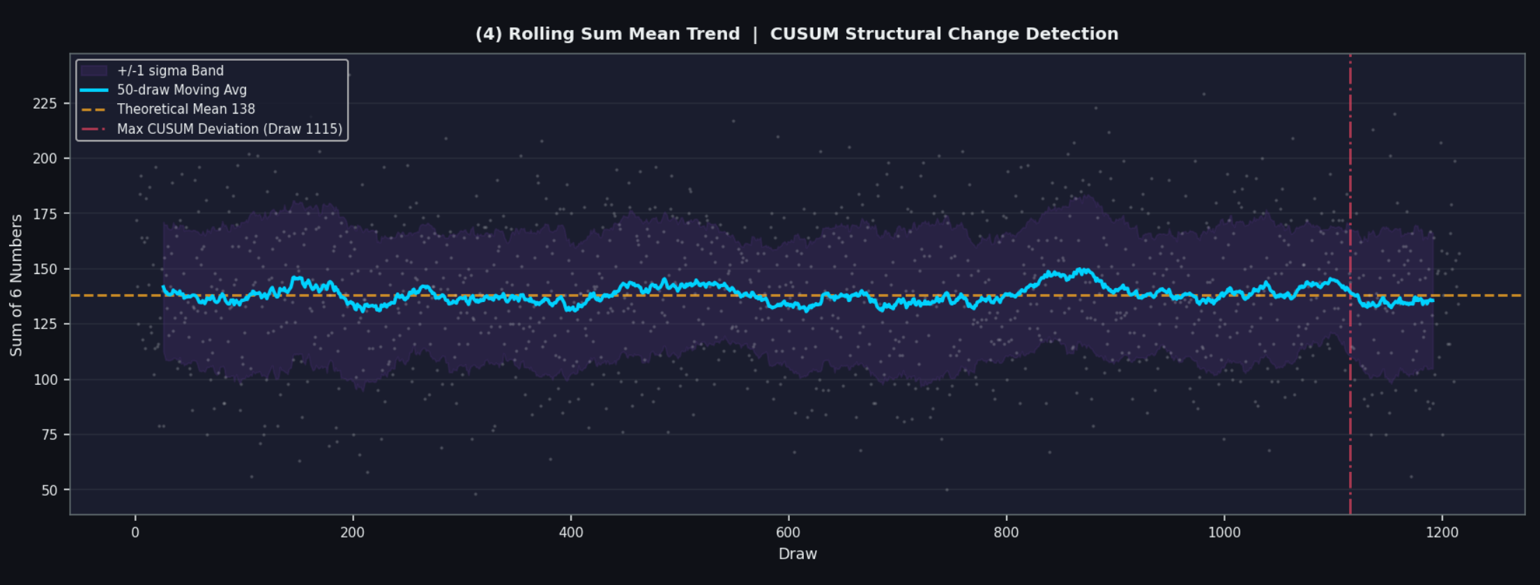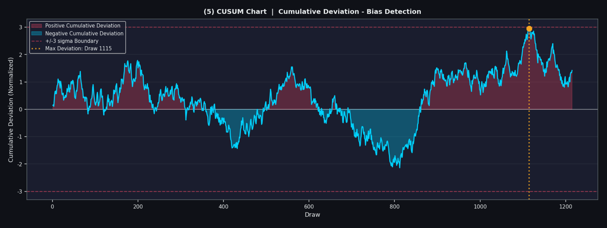 - CUSUM은 1215회 전체데이터 중 Draw 1115를 최대이탈지점으로 지목