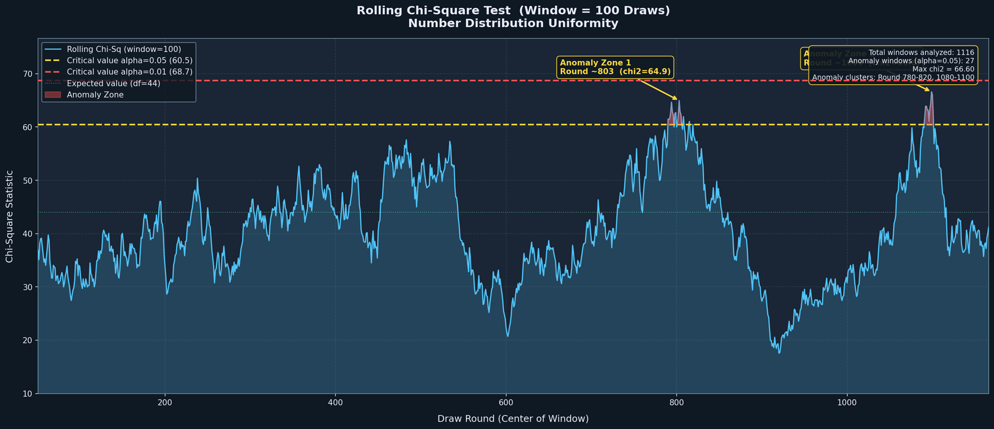 - 이상적인 무작위 추첨 경우, χ²가 44 근처에서 자연스러운 요동이 발생함