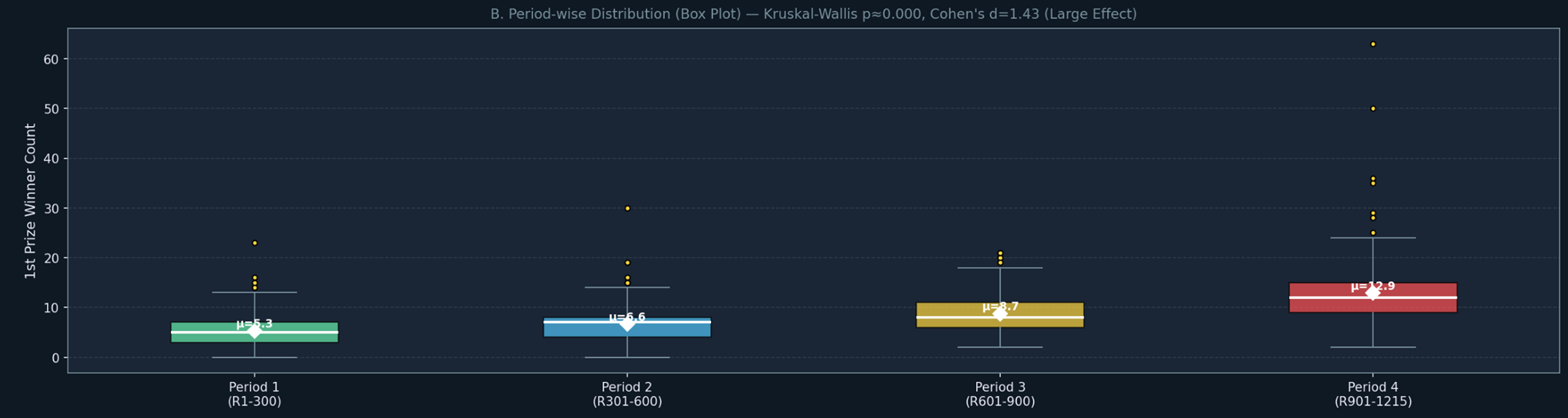 | Period4 | R901~1215 | 12.9명 | 박스 가장 크고 높음, 이상치 50·63 |