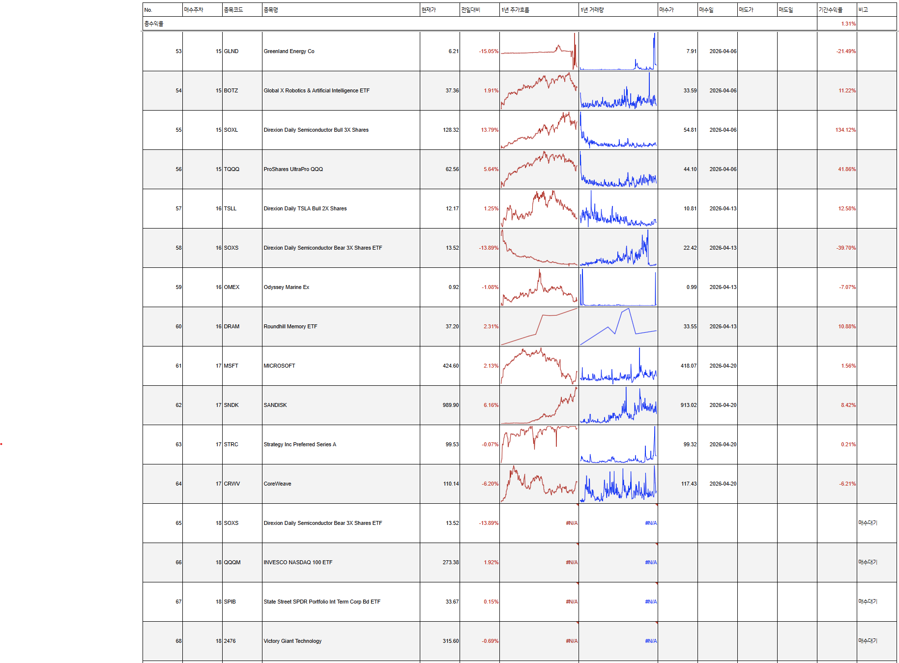 - 2026년 04월 24일 (금) 종가기준으로 2026년 첫 주의 기간내 총수익률은 이전주 +0.81% => +1.31% 로 변경되었다.
