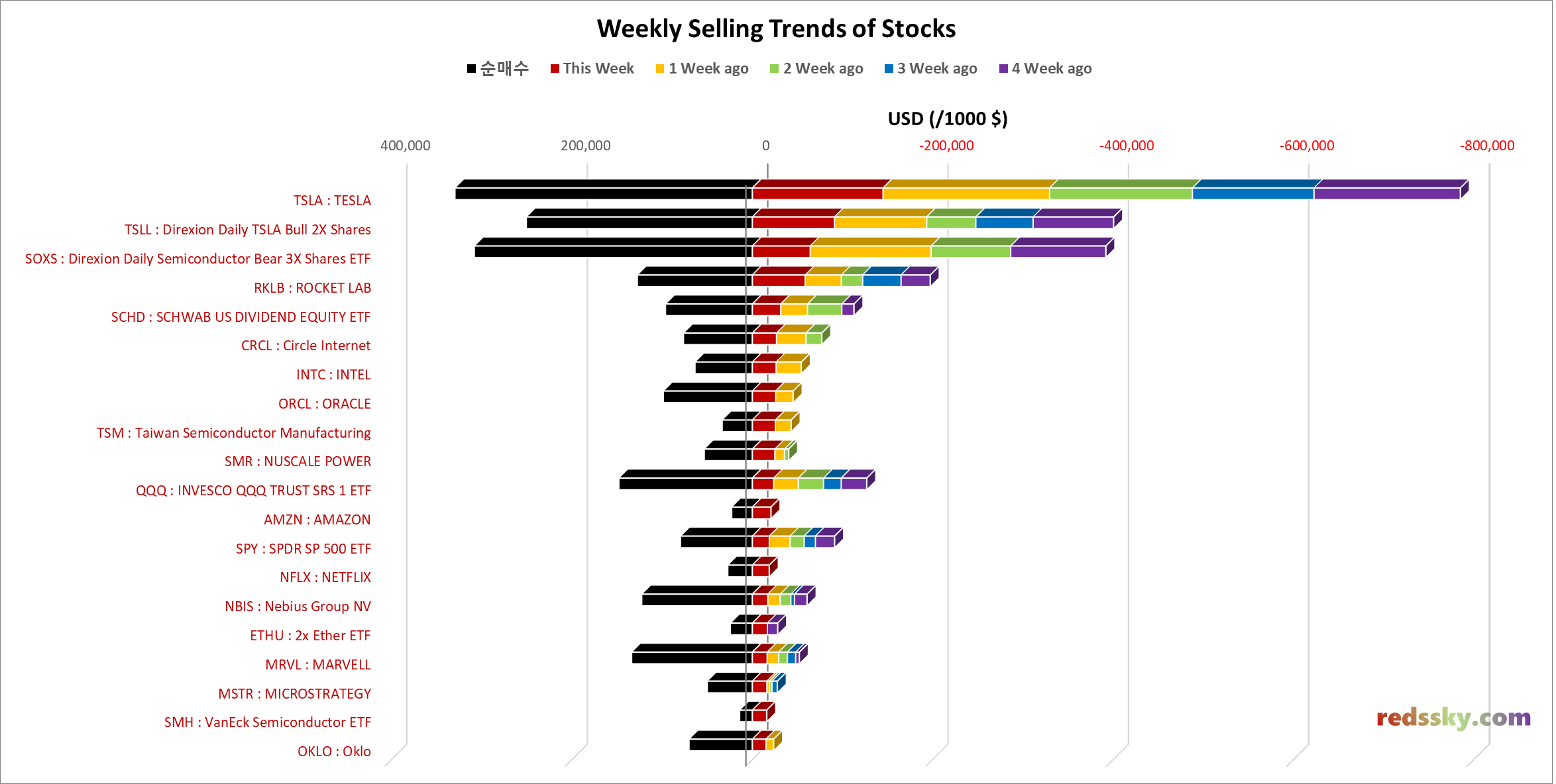 - 지난주 TSLA > TSLL > SOXS > RKLB > SCHD > CRCL > INTC > ORCL > TSM > SMR 순으로 매도가 있었음