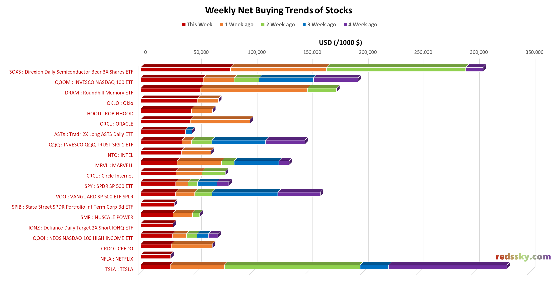 - 지난주 SOXS > QQQM > DRAM > OKLO > HOOD > ORCL > ASTX > QQQ > INTC > MRVL 순으로 순매수가 있었음