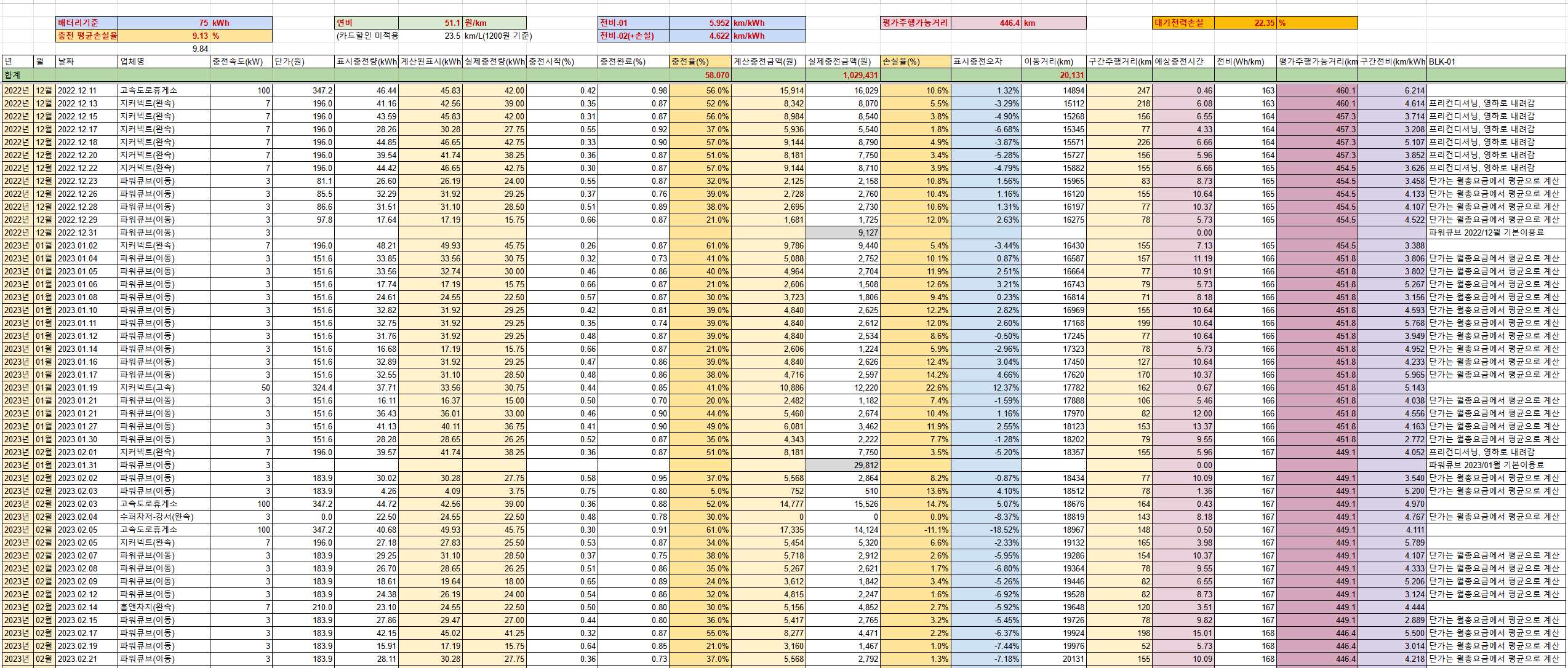 01. 총전비 168(Wh/km), 평가주행가능거리는 446.4km 정도로 전기차 운행효율이 매우 떨어짐
