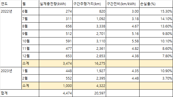 03. 충전 평균손실율은 약 10.02% => 9.13%로 지속적으로 낮아지고 있음. 날씨에 따른 충전시 열손실 에너지량의 감소와 3kWh 완속충전 위주로 충전하면 충전손실율이 계속해서 낮아지고 있는 것으로 생각됨. 봄을 지나 날씨가 풀리게 되면 충전손실율이 다시 높아질 수 있을 것으로 보여짐