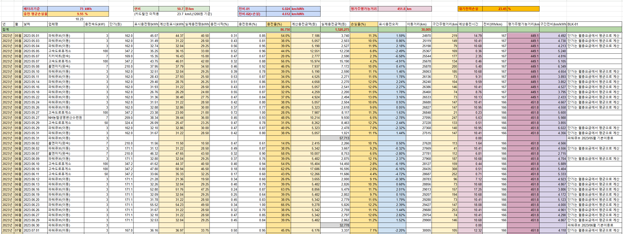 08. 운행기간동안 충전시 전력손실이 크게 줄어듦. 배터리 프리컨디셔닝을 시행하지 않았으나 고속충전간 배터리 충전손실이 이전에 비해서 크게 감소된 것이 원인으로 생각됨