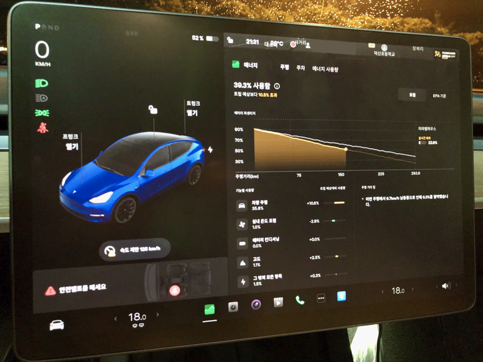 (7) 네이버 내비게이션을 기준으로 주행시 네이버 내비게이션에 표시되는 속도가 모델Y 디스플레이에 표시되는 속도보다 항상 1~2km 정도 빠름. (정속주행속도를 네이버 내비게이션을 기준으로 모델Y의 속도를 1~2km 낮춰 설정하면 트립 예상대비 사용량이 크게 개선됨) 아이온(iON) 타이어가 순정타이어보다 직경이 약 2.5cm 큰 편인데 타이어 교체시 타이어 조건이 재설정되었음에도 속도차가 발생하는 것을 보면 그 차이가 아마 설정 오차내에 있어서 인식오류로 나타나는거 같음 (이렇게 속도를 줄이면 "트립 예상대비 사용량"의 초과사용 정도를 비교적 줄일 수 있음)